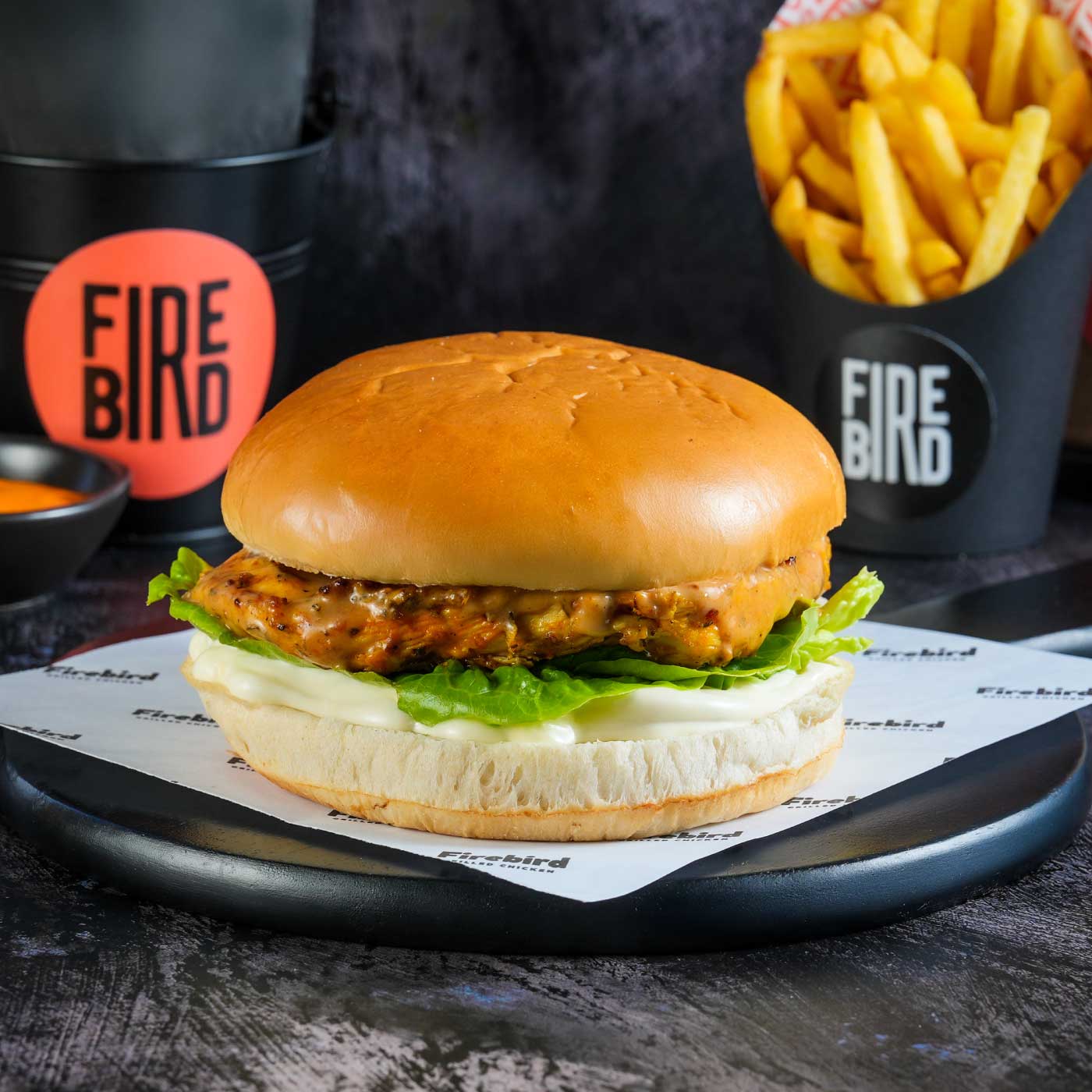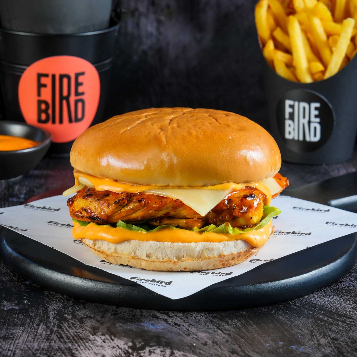 Peri Peri Grilled Butterfly Chicken, Chipotle Mayo, Gouda Cheese, Caramelised Onions & Lettuce Potato bun